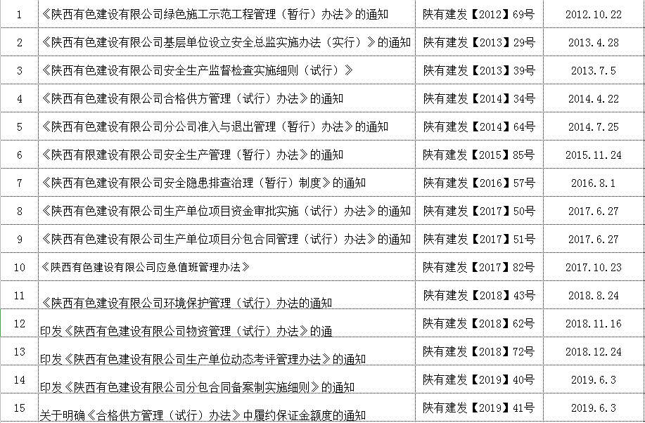 三、公司管理體系制度不斷完善健全。制定了《陜西有色建設(shè)有限公司安全生產(chǎn)管理手冊》《陜西有色建設(shè)有限公司文明施工、綠色施工管理手冊》《陜西有色建設(shè)有限公司VIS企業(yè)視覺識(shí)別系統(tǒng)》。