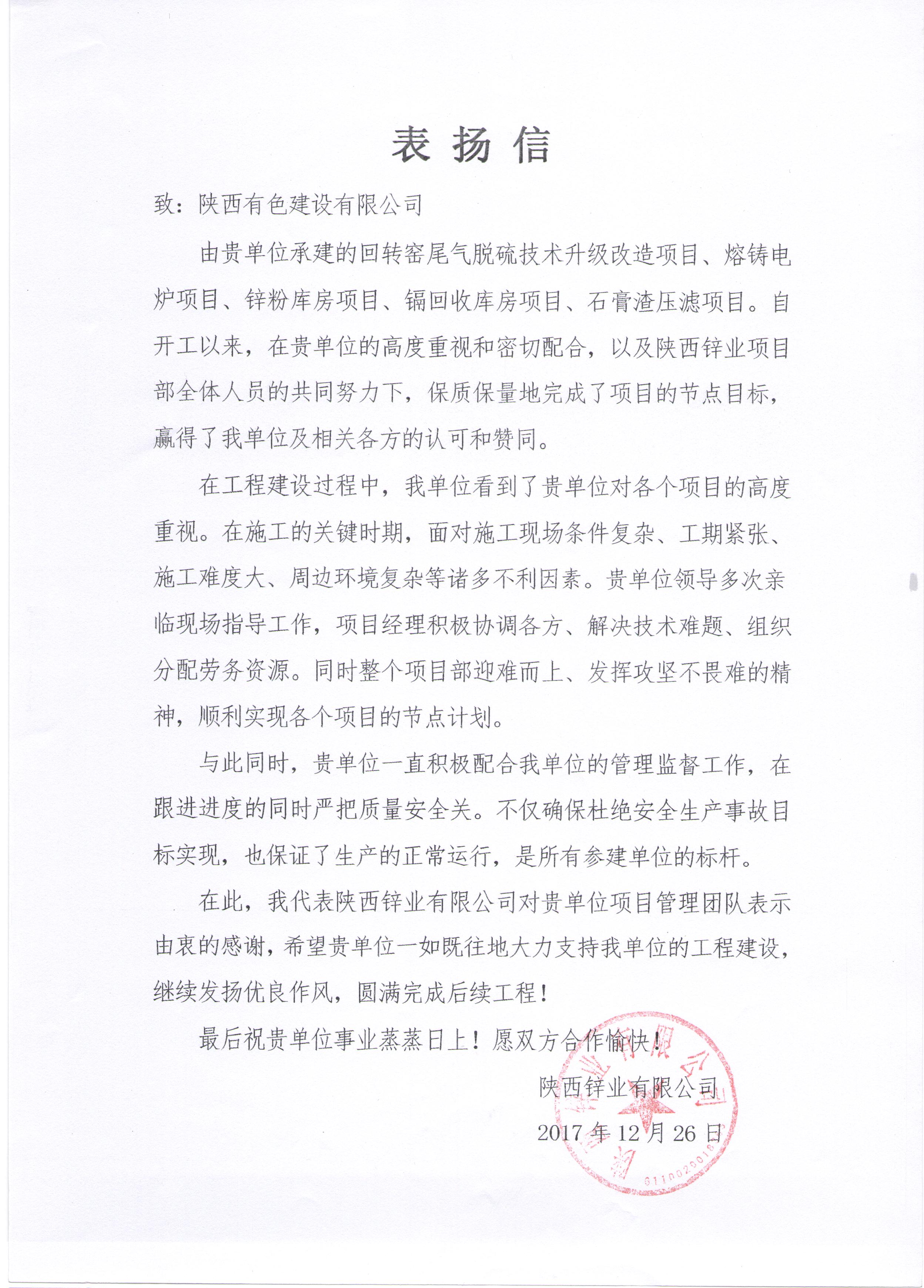 近日,公司收到陜西鋅業(yè)有限公司發(fā)來的表揚信,公司陜西鋅業(yè)項目部在回轉窯尾氣脫硫技術升級改造等5個項目建設過程中取得的成績表示感謝和高度贊揚。