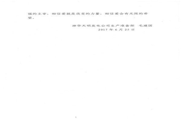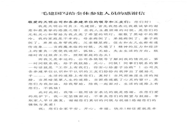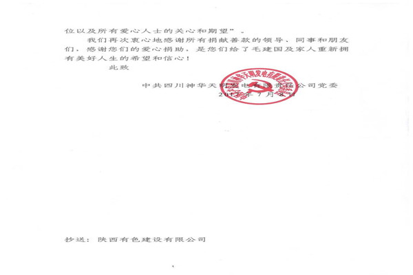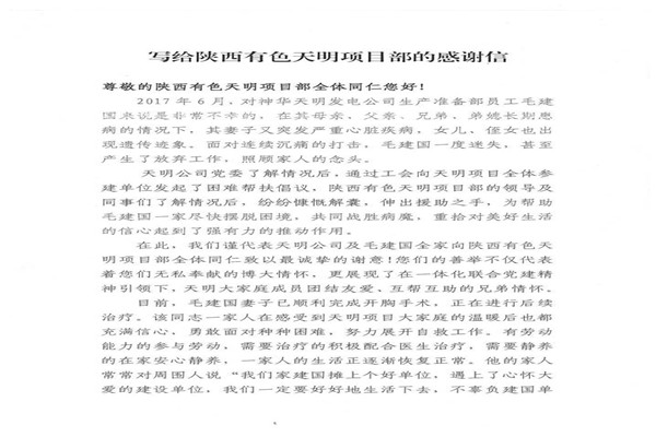 信中指出,神華天明發(fā)電公司員工毛建國家人長期患病,妻子又突發(fā)嚴重的心臟病,讓原本不富裕的家庭更是雪上加霜。在了解到相關(guān)情況后,神華天明項目部負責(zé)人高度重視,積極開展愛心捐款活動,為毛建國一家伸出了援助之手,幫助其度過難關(guān)。