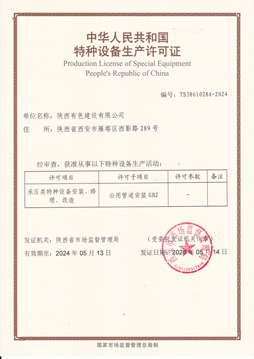 近日,經(jīng)陜西省市場(chǎng)監(jiān)督管理局審批,陜西省特種設(shè)備協(xié)會(huì)評(píng)審組現(xiàn)場(chǎng)鑒定評(píng)審,西安市市場(chǎng)監(jiān)督管理局核準(zhǔn)發(fā)布,公司新添中華人民共和國(guó)特種設(shè)備生產(chǎn)許可證——壓力管道GB2資質(zhì)。